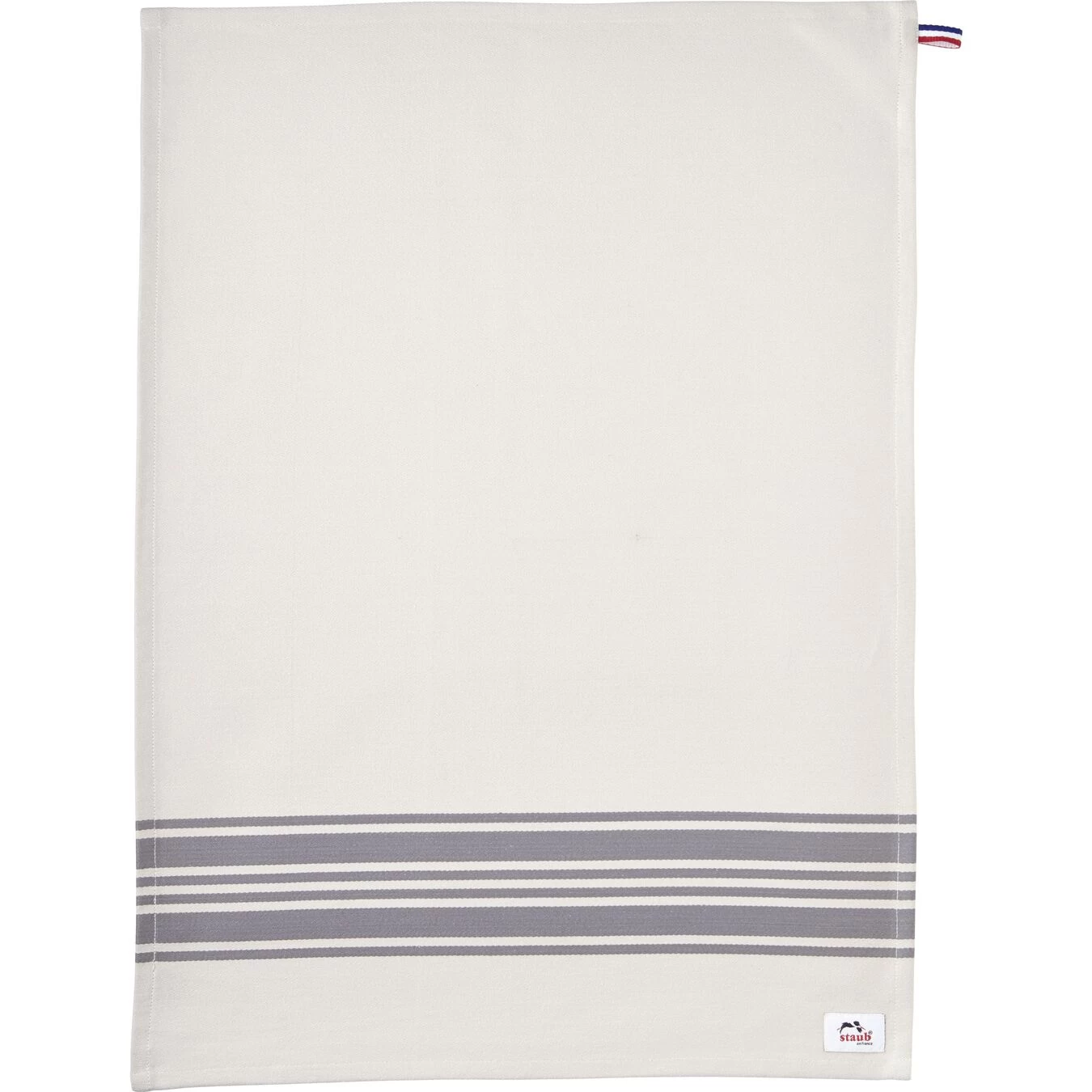 Praktisch, hochwertig und in edlem Design: das neue STAUB Küchenhandtuch erfüllt alle Kriterien, die gute Kochutensilien ausmachen. STAUB typisch ist auch die hochwertige Verarbeitung für größtmögliche Funktionalität und lange Lebensdauer. Beides wird durch einen Stoff aus 100 % Baumwolle mit hoher Saugfähigkeit, umgenähten Säumen an allen vier Seiten und einem fest vernähten Aufhänger gewährleistet. Mit den Maßen 50 x 70 cm ist das Küchenhandtuch für alle Aufgaben von Abtrocknen bis Polieren ideal geeignet und als wichtiges Helferlein unentbehrlich. Neben der Funktion spielt auch der optische Auftritt in jeder anspruchsvollen Küche eine wichtige Rolle. Entsprechend ist das zeitlose Design mit grauen Streifen auf dem naturweißen Stoff in jeder Umgebung ein stilvolles, dekoratives Element. Noch mehr schöne Details sind das dezente Etikett mit STAUB Logo und das kleine Fähnchen in den Farben der französischen Tricolore – jeweils weltweit anerkannte Markenzeichen außergewöhnlicher Kochkunst.