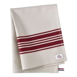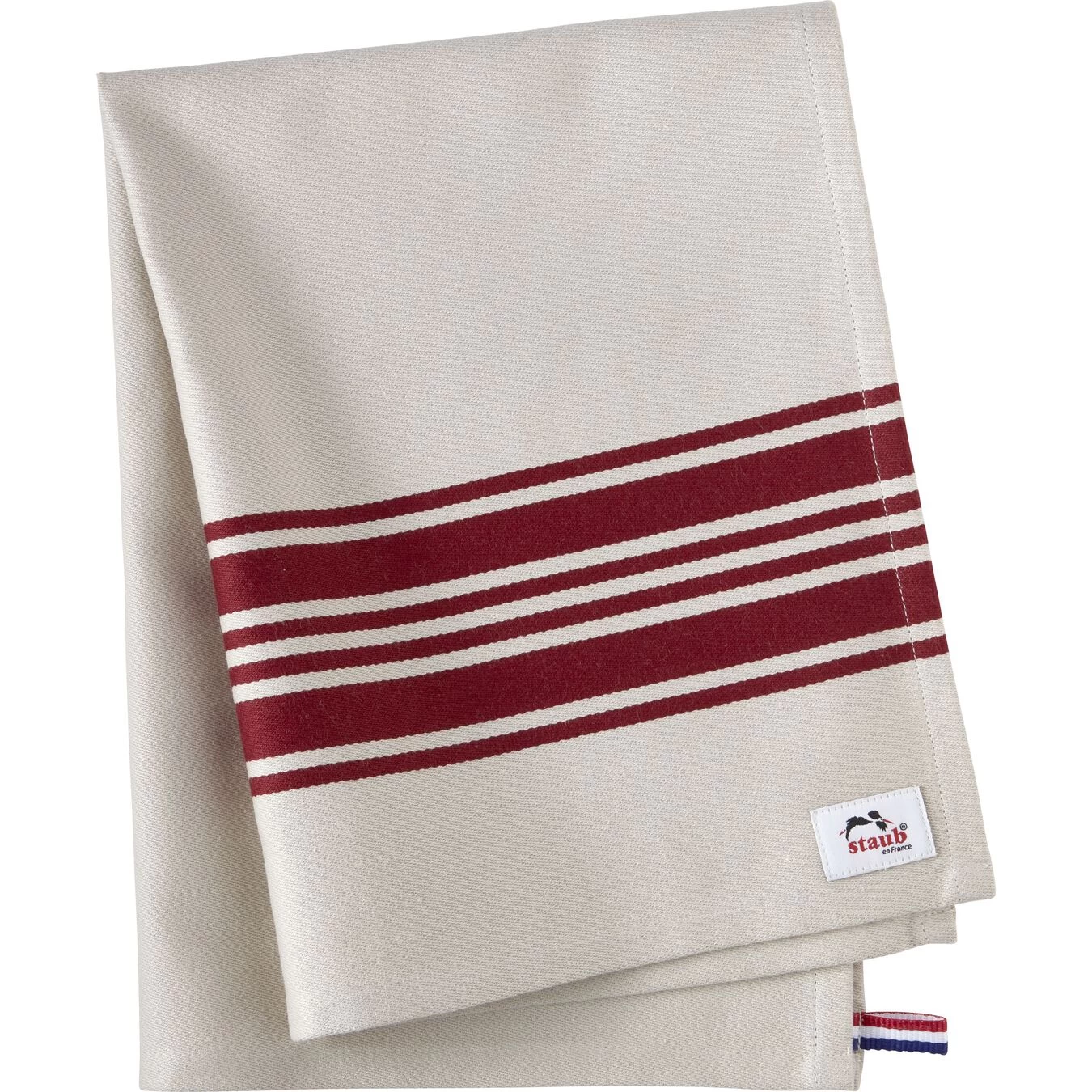 Das neue STAUB Küchenhandtuch in den Maßen 50 x 70 cm ist der perfekte Allrounder für die Küche. In bewährter STAUB Qualität erledigt es sämtliche Aufgaben, die für das hilfreiche Stofftuch vorgesehen sind mit Bravour: Trocknen, Abtrocknen, Wischen, Polieren – Kochen ohne Küchenhandtuch ist tatsächlich kaum vorstellbar. Dazu ist es aus besonders saugfähiger, reiner Baumwolle gefertigt und für lange Haltbarkeit hochwertig verarbeitet: in einer Ecke befindet sich ein fest vernähter, praktischer Aufhänger und die Säume sind auf allen vier Seiten umgeschlagen. Hervorzuheben ist auch das zeitlos-edle Design. Die warmen, karminroten Streifen bilden einen feinen Kontrast auf dem naturweißen Stoff und passen genauso gut in eine Landhausküche, wie zu einem minimalistischen Küchenkonzept oder zu einer funktionellen Profiküche. Ein dezentes Etikett mit STAUB Logo verrät den Hersteller, das kleine Fähnchen in den Farben der französischen Tricolore die Herkunft des Designs. In jedem Fall ist das STAUB Küchenhandtuch eine Bereicherung für jede Küche.