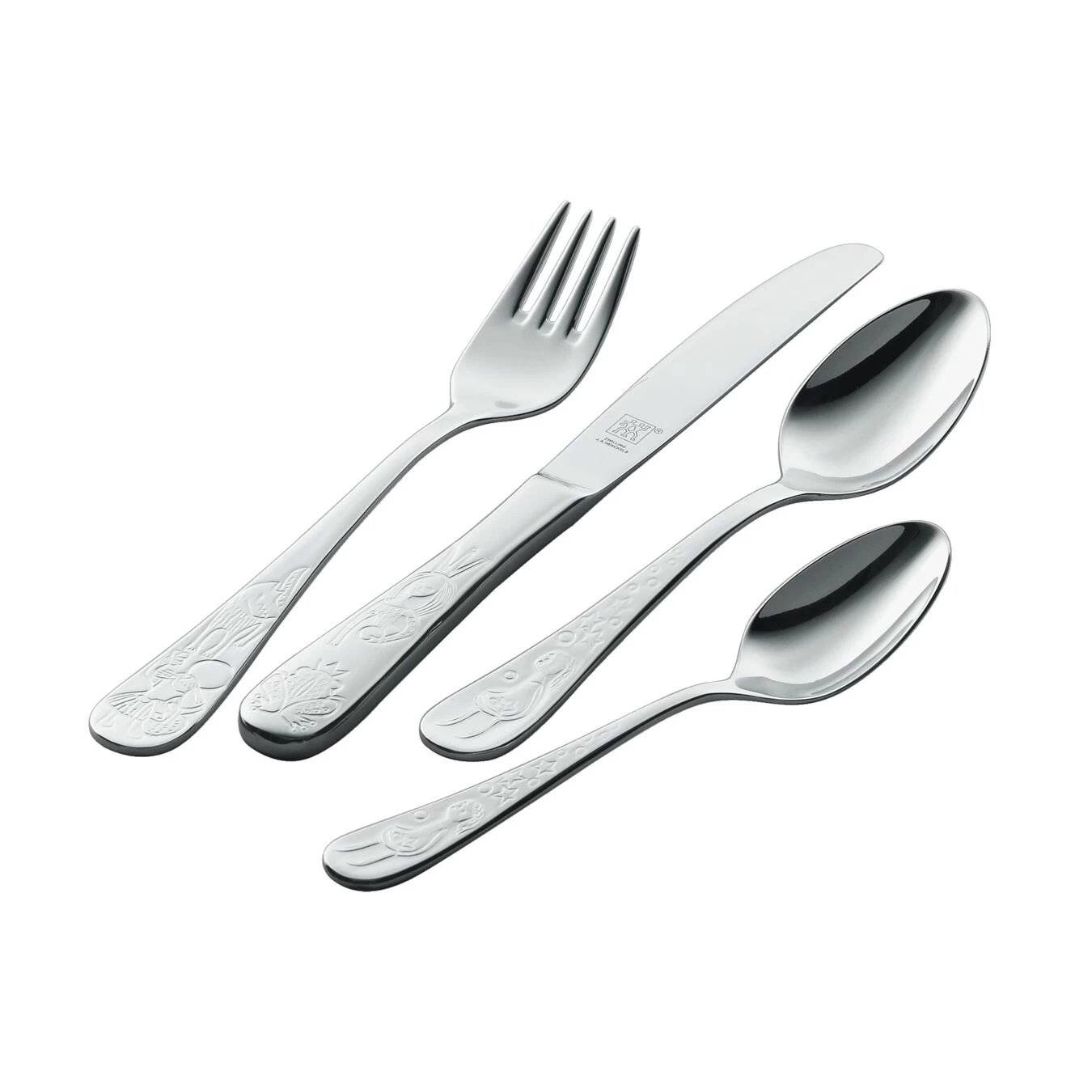 Kinder lieben Märchen. Froschkönig, Rotkäppchen und Sterntaler der Gebrüder Grimm beflügeln nicht nur die Fantasie der Kleinen. Das passende 4-teilige Kinderbesteck von ZWILLING hilft Kindern ab 3 Jahren auch dabei, selbstständig essen zu lernen. Das formstabile Besteck aus hochwertigem, hygienischem Edelstahl mit den geprägten Märchen-Motiven ist speziell auf die kleinen Hände abgestimmt. Die abgerundeten Löffelkanten, die Messerschneide ohne Wellenschliff sowie die abgestumpften Gabelspitzen sorgen dabei für mehr Sicherheit bei der Handhabung. Das Besteck in ZWILLING Qualität ist robust, langlebig sowie farbecht. Und durch das besondere Material auch perfekt für die Reinigung in der Spülmaschine geeignet.